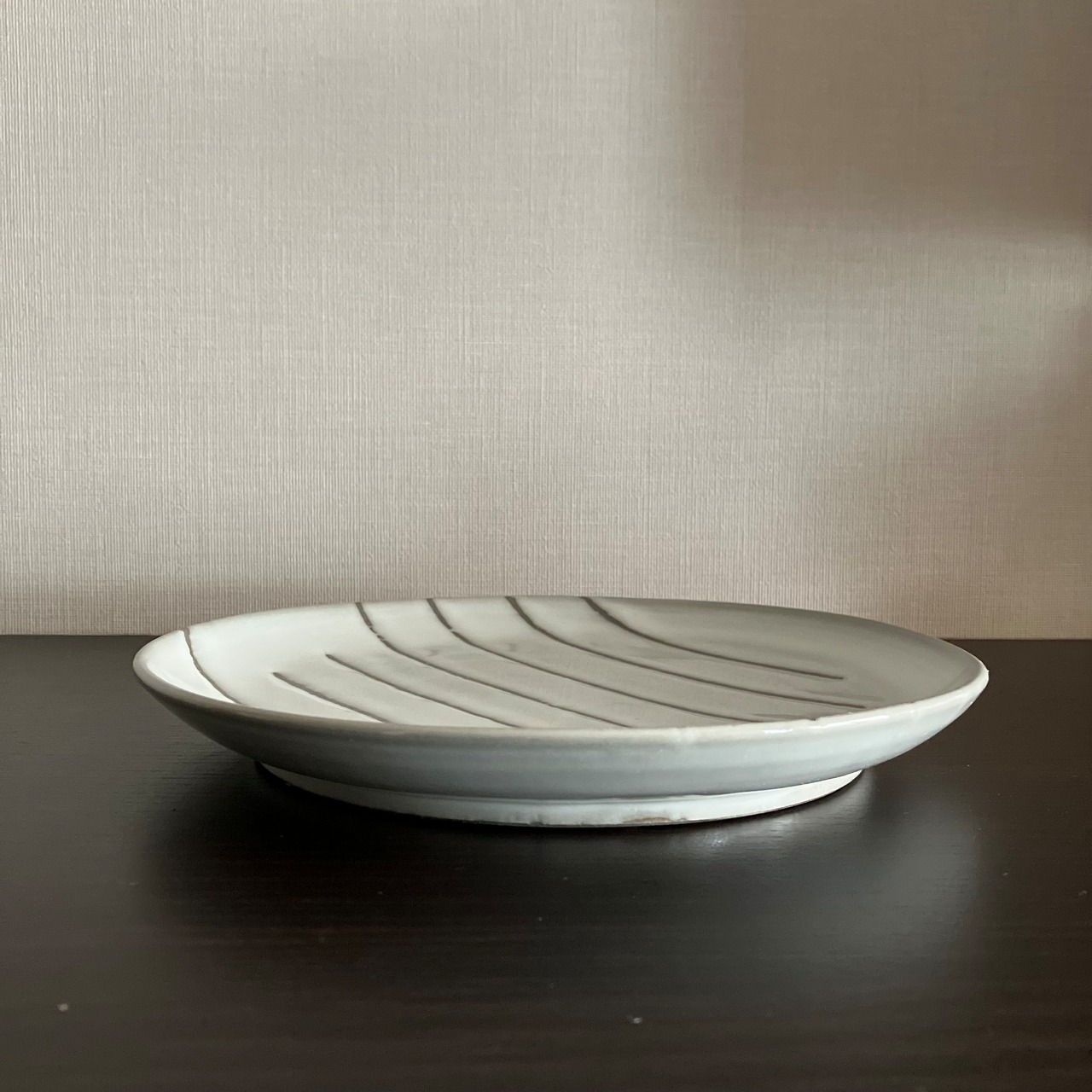 平行に走る細やかな線模様を、やわらかな乳白釉がそっと包み込みます。