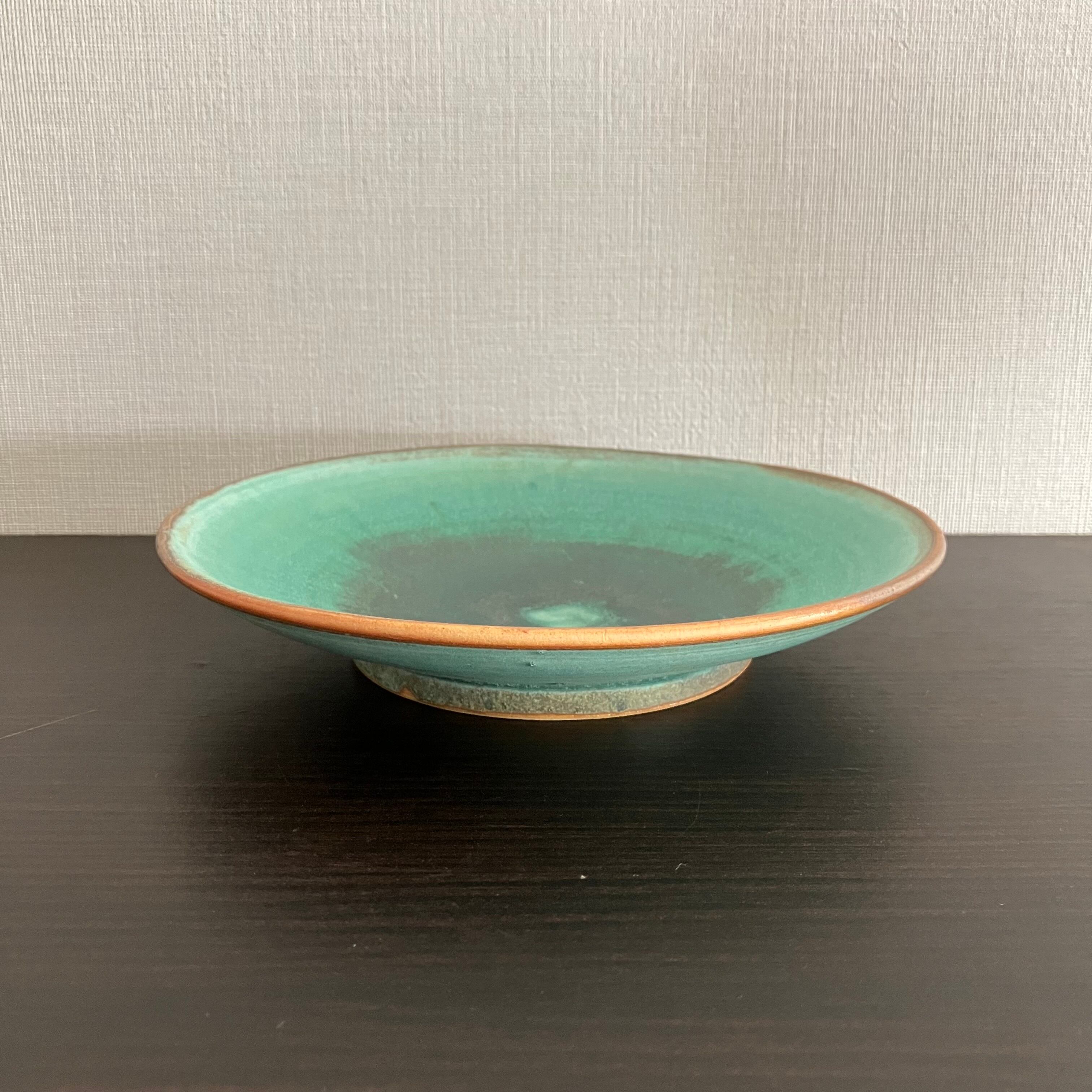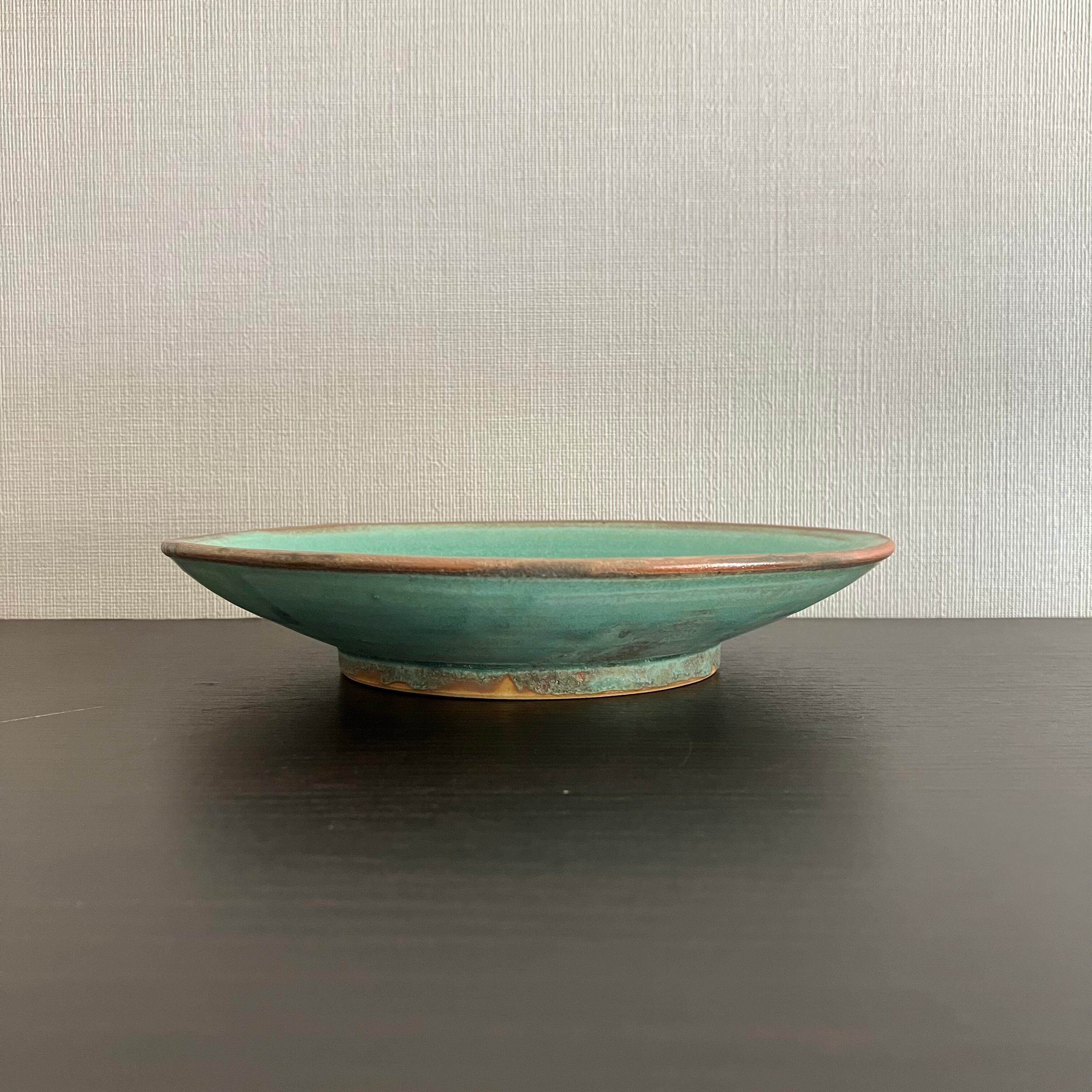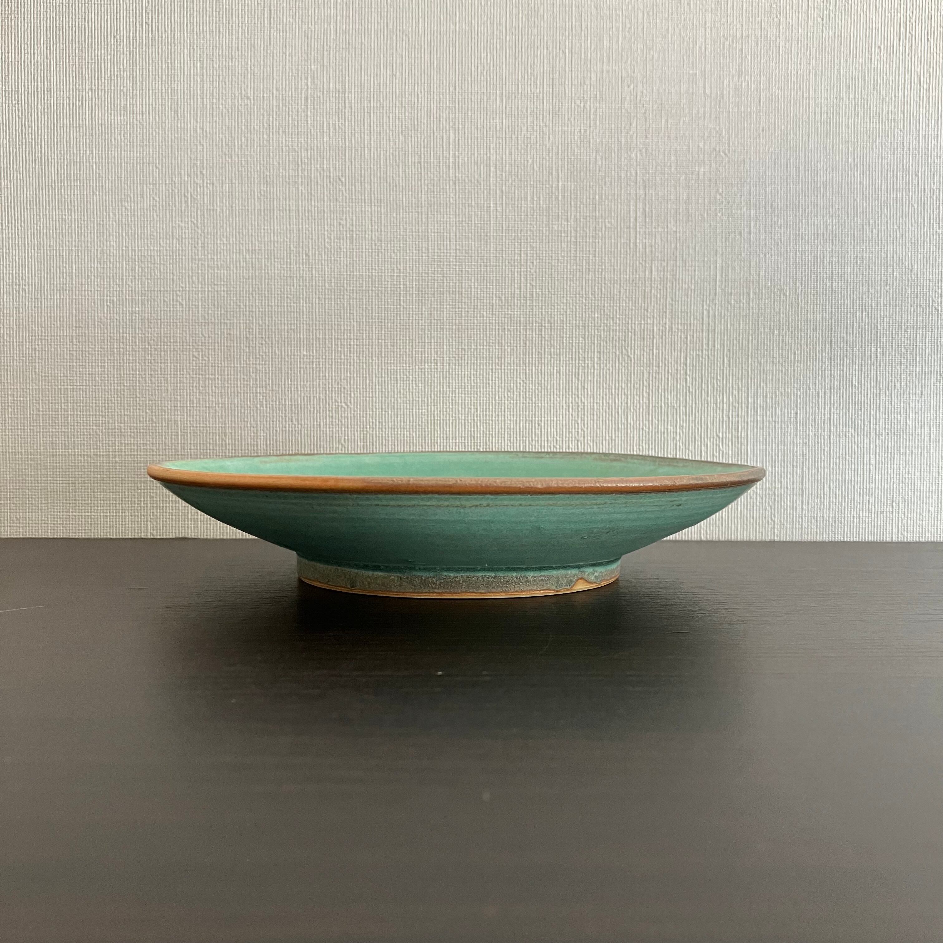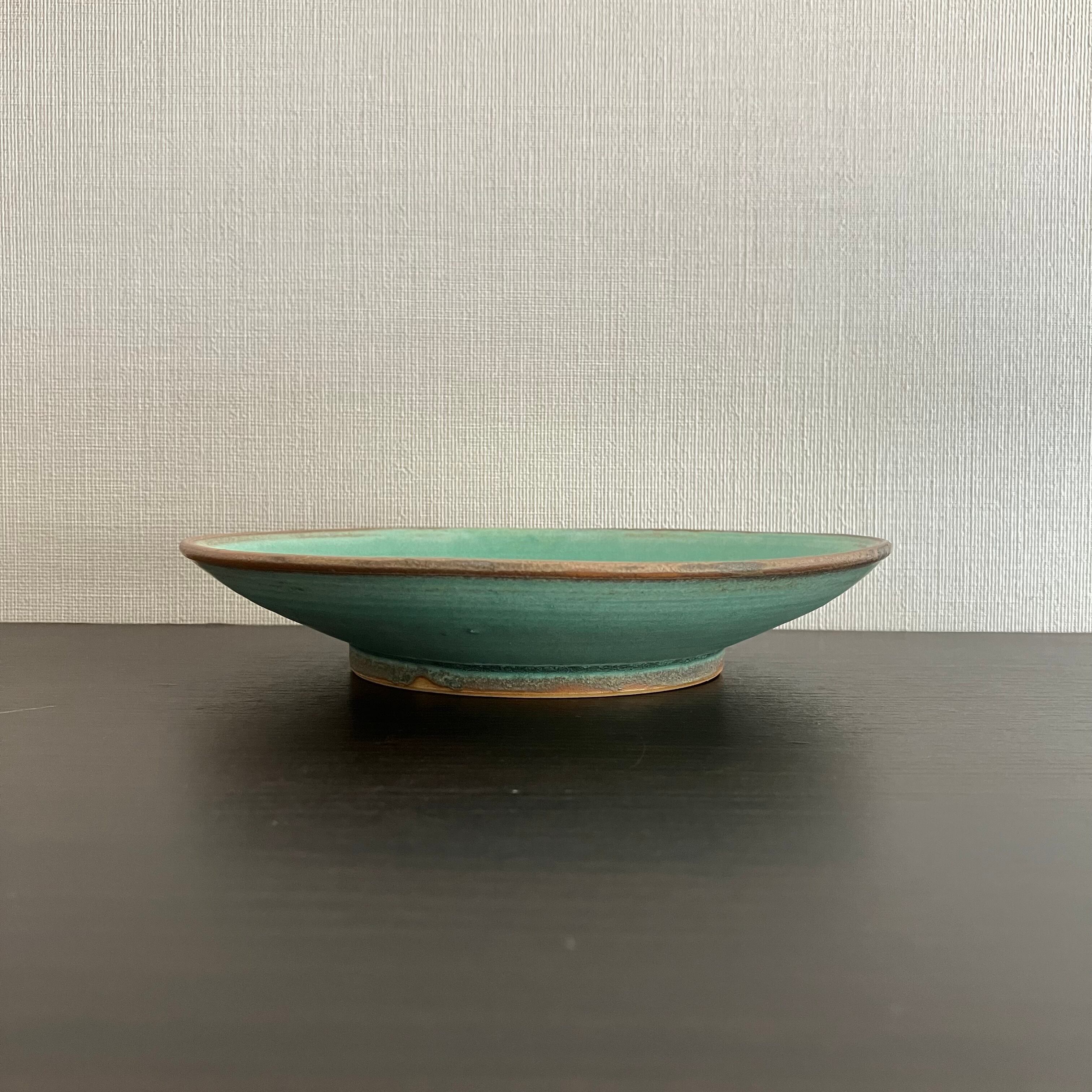 禾目トルコ結晶釉が織りなす、深みのあるグリーン。 中心に向かって広がる釉のグラデーションは、まるで水面のゆらめきを閉じ込めたよう。 静かな存在感で、料理を美しく引き立てます。