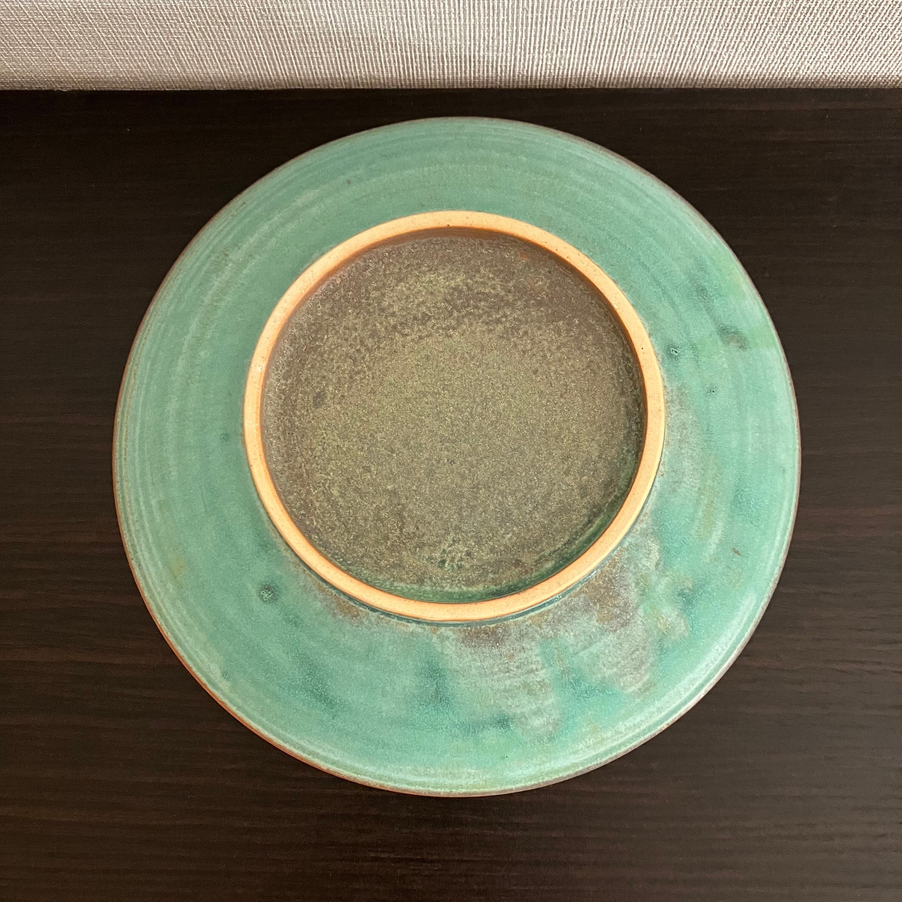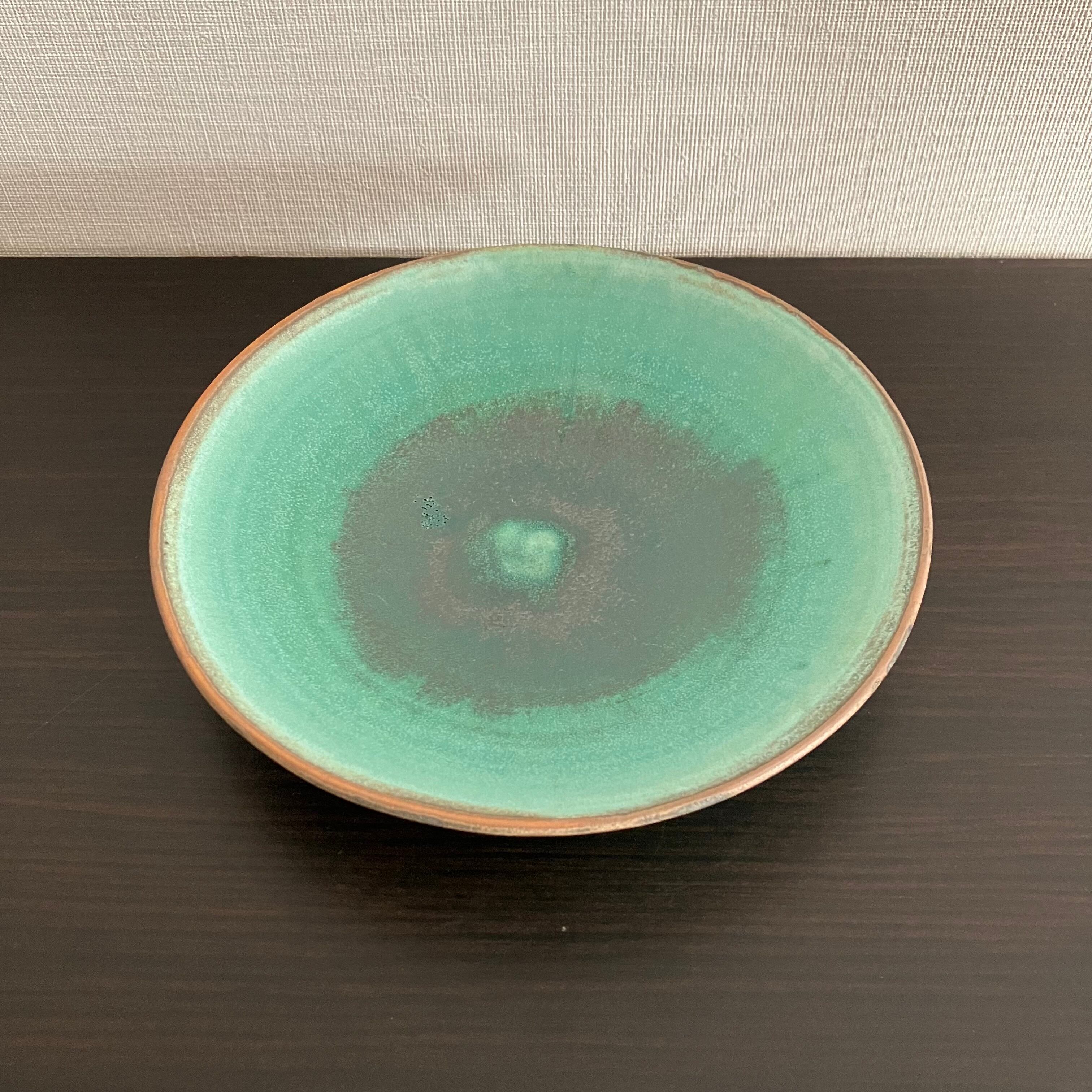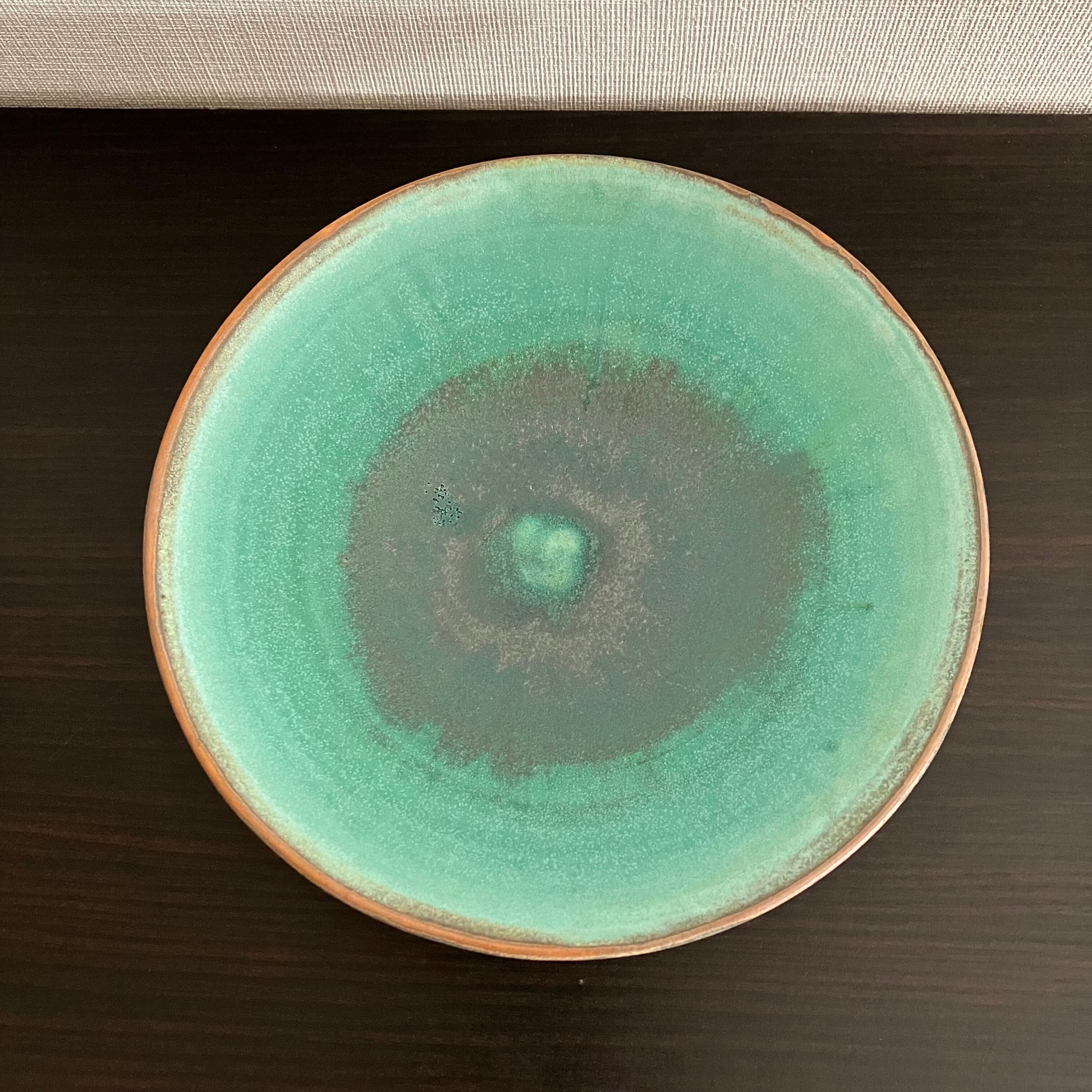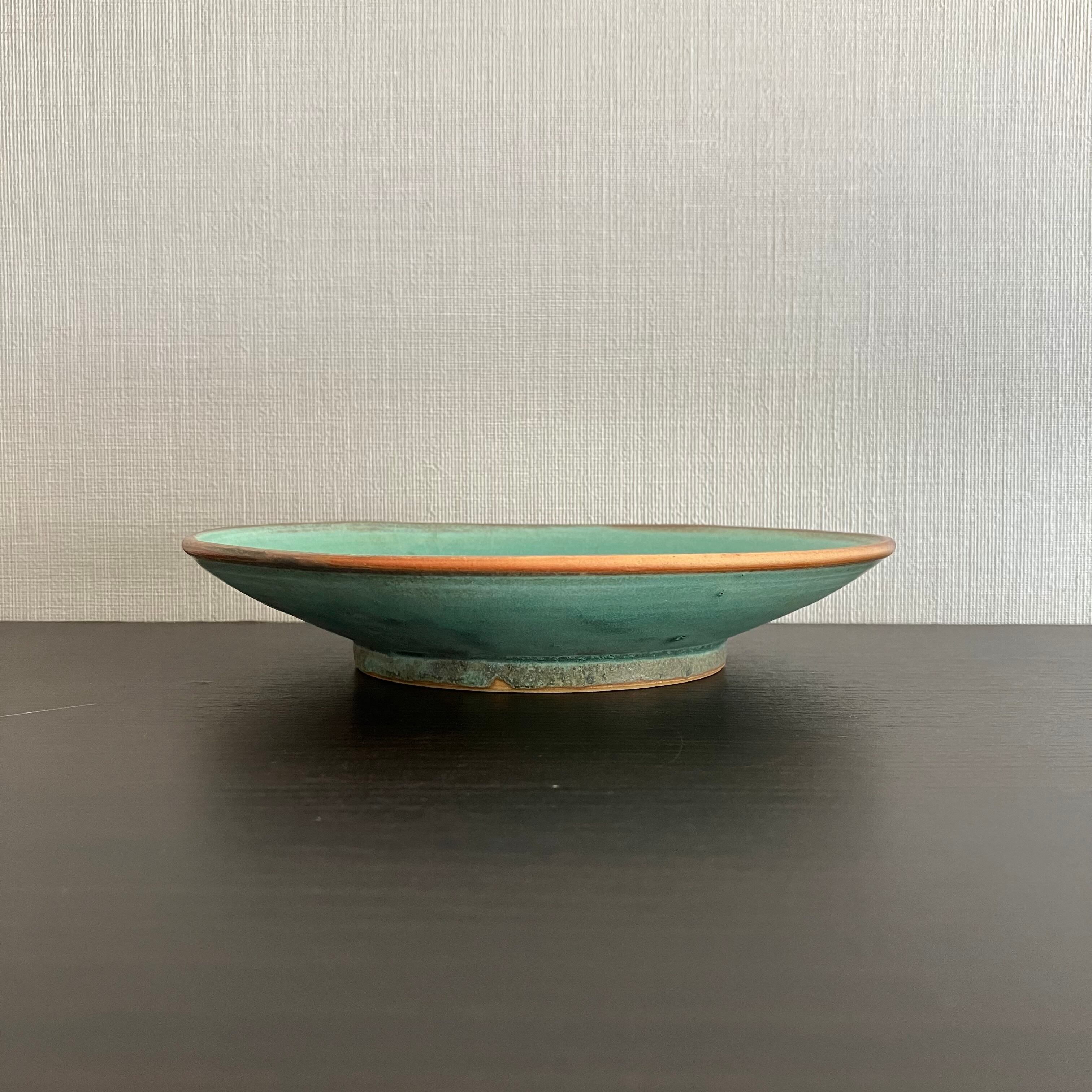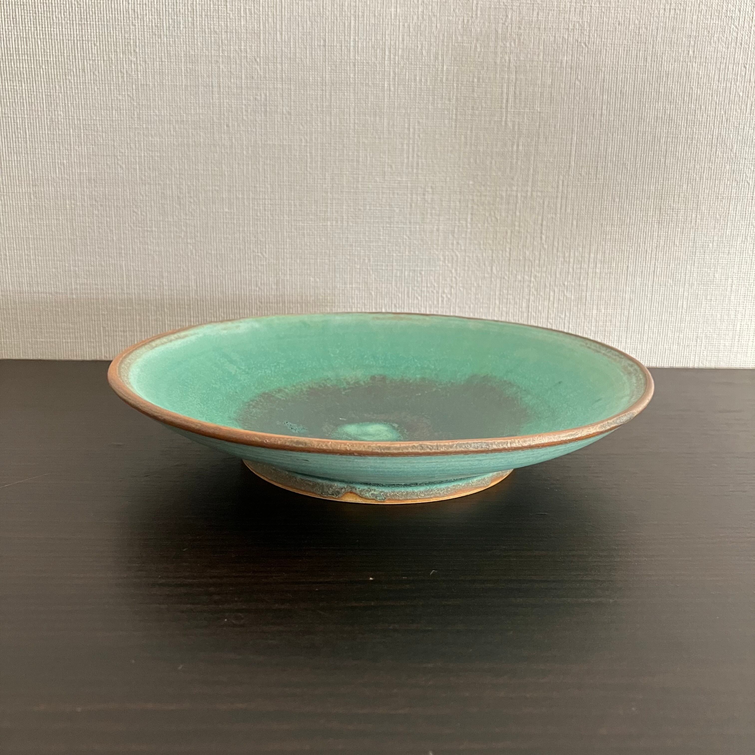 禾目トルコ結晶釉が織りなす、深みのあるグリーン。 中心に向かって広がる釉のグラデーションは、まるで水面のゆらめきを閉じ込めたよう。 静かな存在感で、料理を美しく引き立てます。